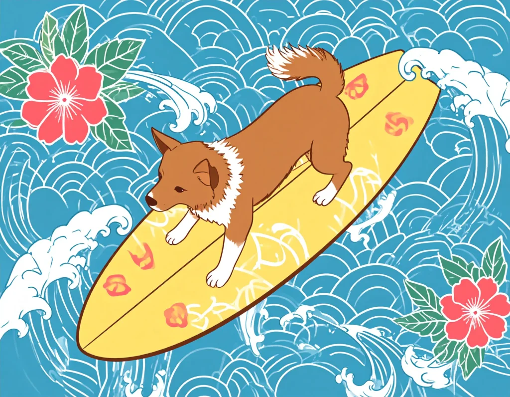 Exempelprompten kan då vara följande: “En hund som rider på en surfbräda i Ukiyo-e stil utifrån ett fågelperspektiv” Då kan det se ut så här. (genererat i Adobe Firefly)